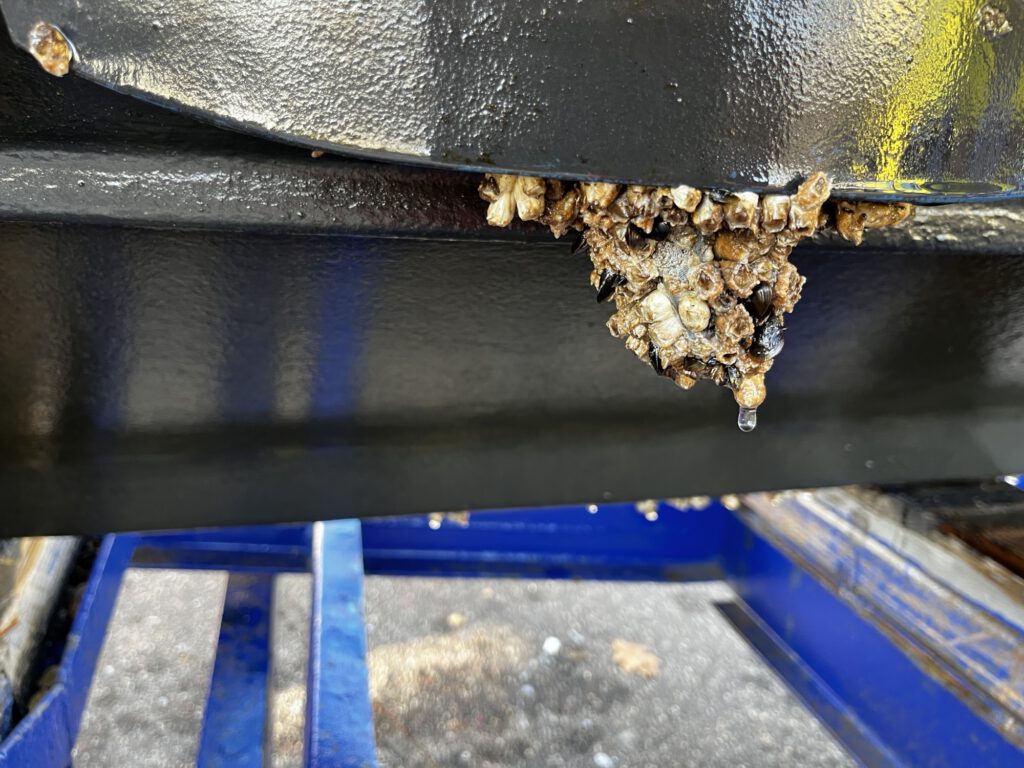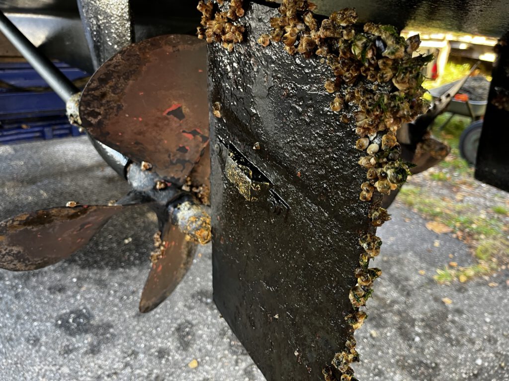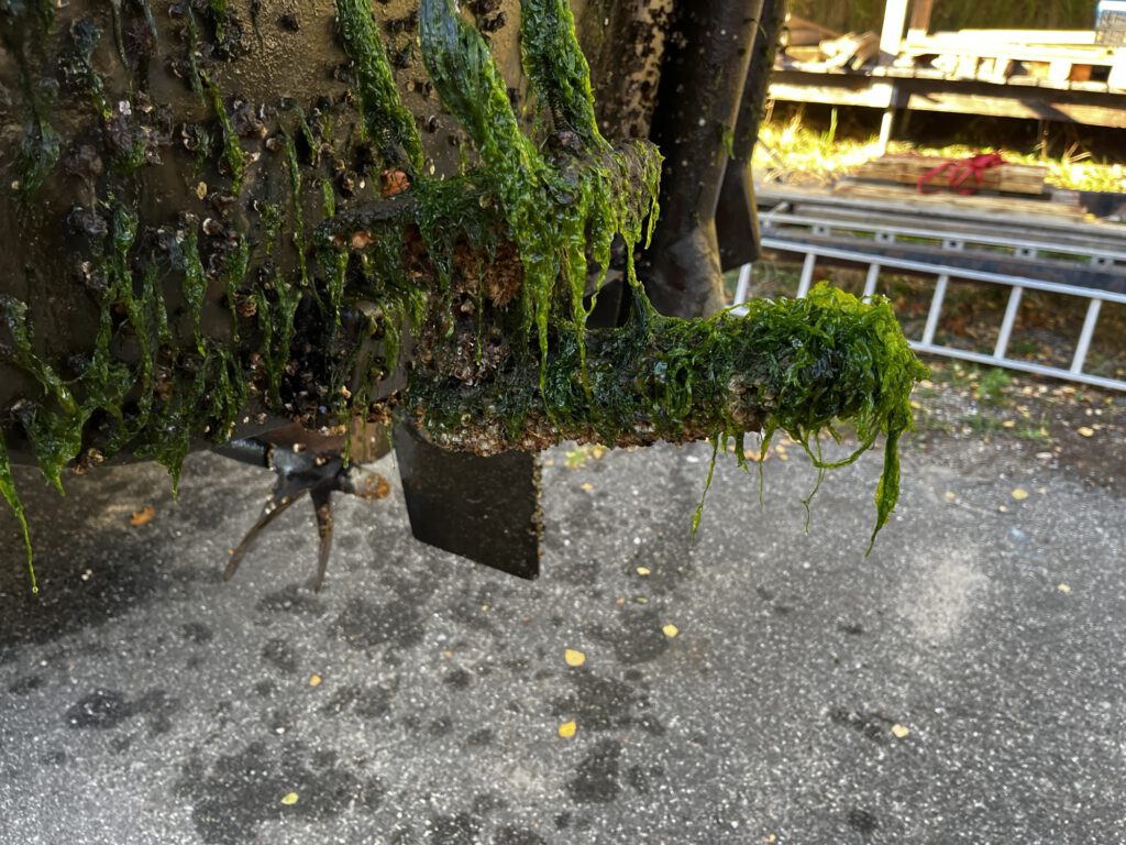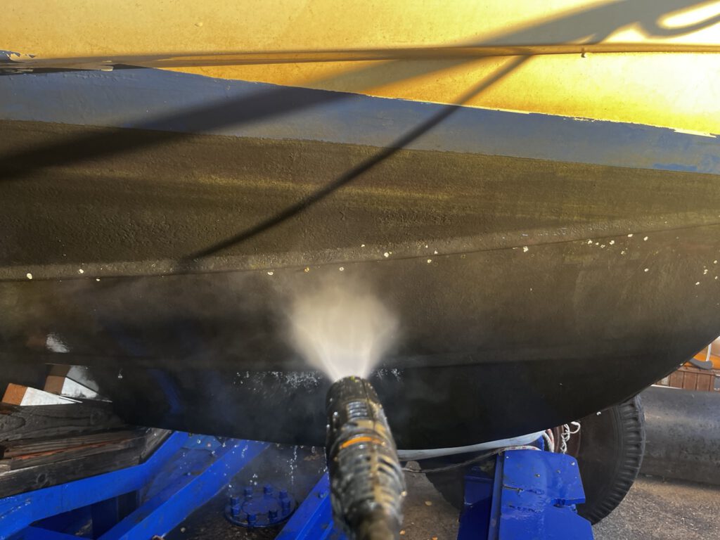 Zurück im Zelt begann die Nacharbeit: Auf einer ausgebreiteten Plane wurden zunächst die Muscheln und Bewuchsreste vom Rumpf abgeschabt und zusammengefegt. Danach wurde der gesamte Rumpf gründlich gekärchert, bis er wieder im vertrauten Glanz erstrahlte.