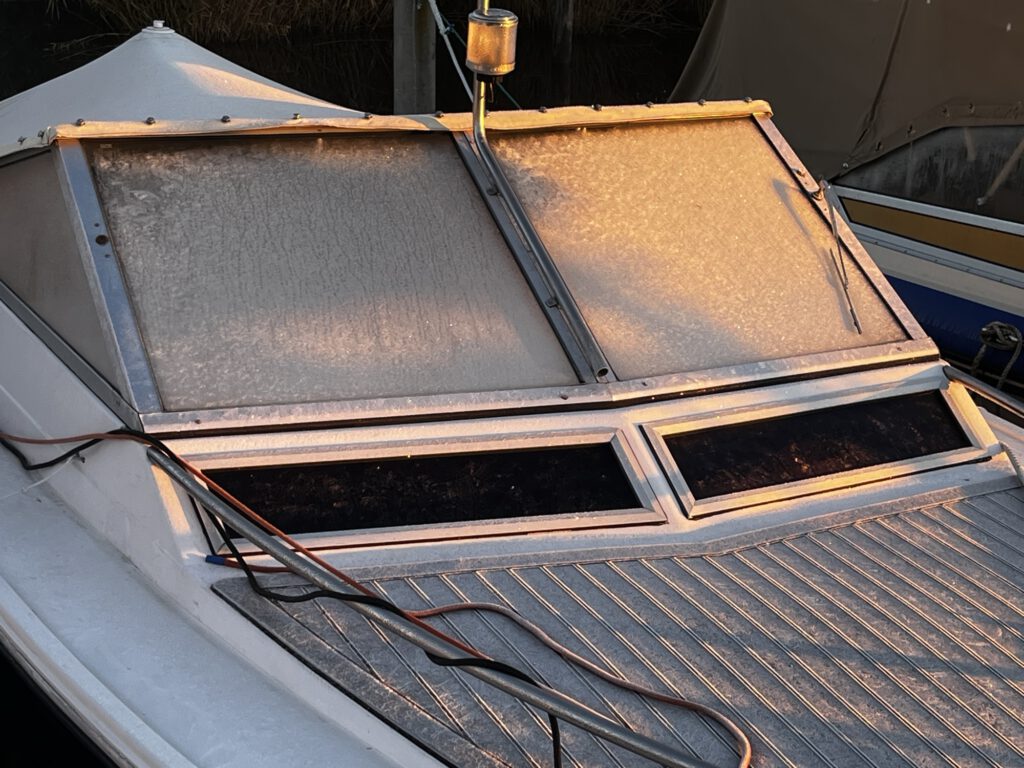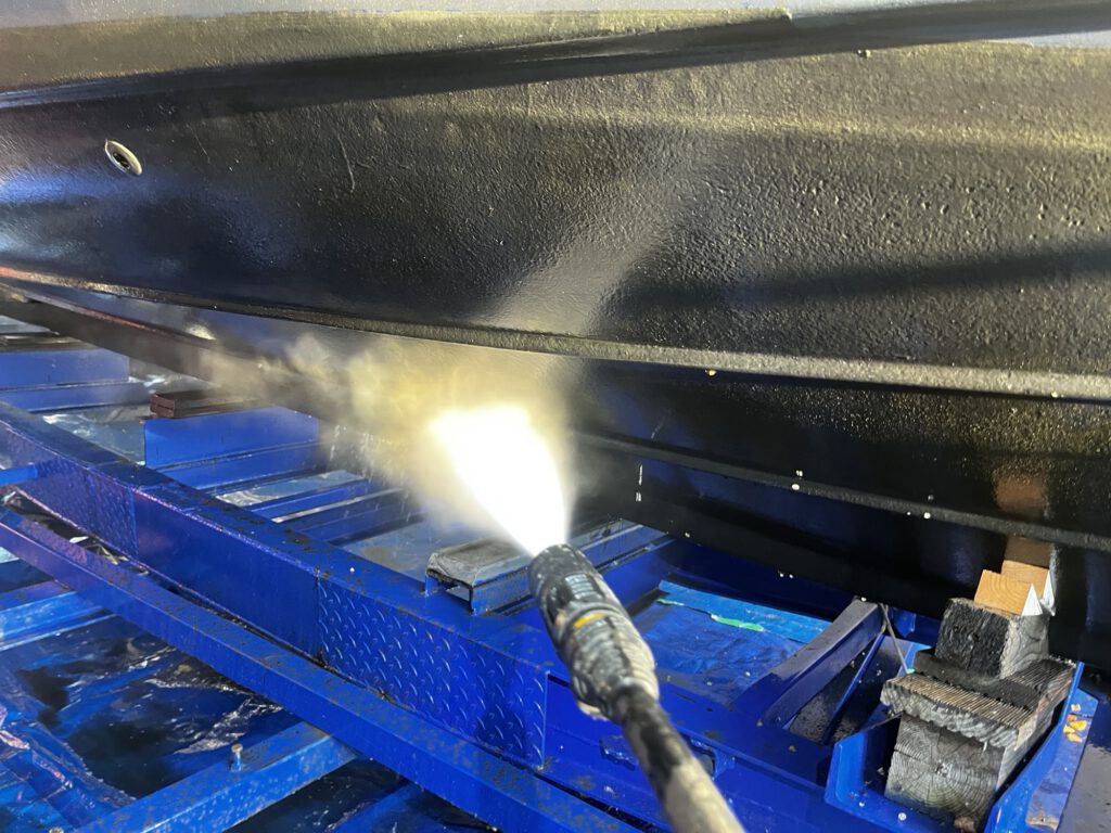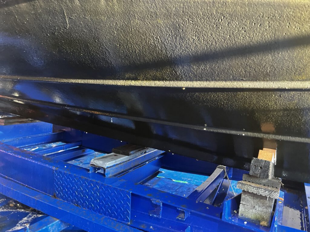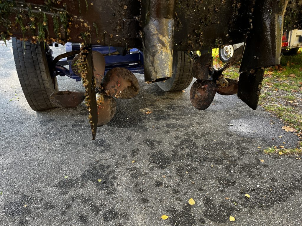 Zurück im Zelt begann die Nacharbeit: Auf einer ausgebreiteten Plane wurden zunächst die Muscheln und Bewuchsreste vom Rumpf abgeschabt und zusammengefegt. Danach wurde der gesamte Rumpf gründlich gekärchert, bis er wieder im vertrauten Glanz erstrahlte.