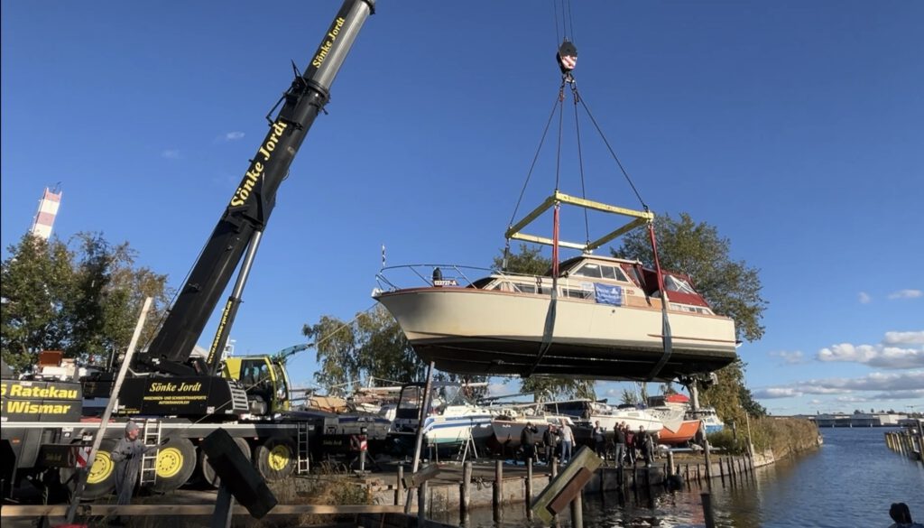 Eine YouTube-Livekamera zeichnete den gesamten Ablauf auf – von der letzten Fahrt bis zum spektakulären Moment, als der Kran die Marisol aus der Trave hob und sie sanft auf dem Trailer absetzte.